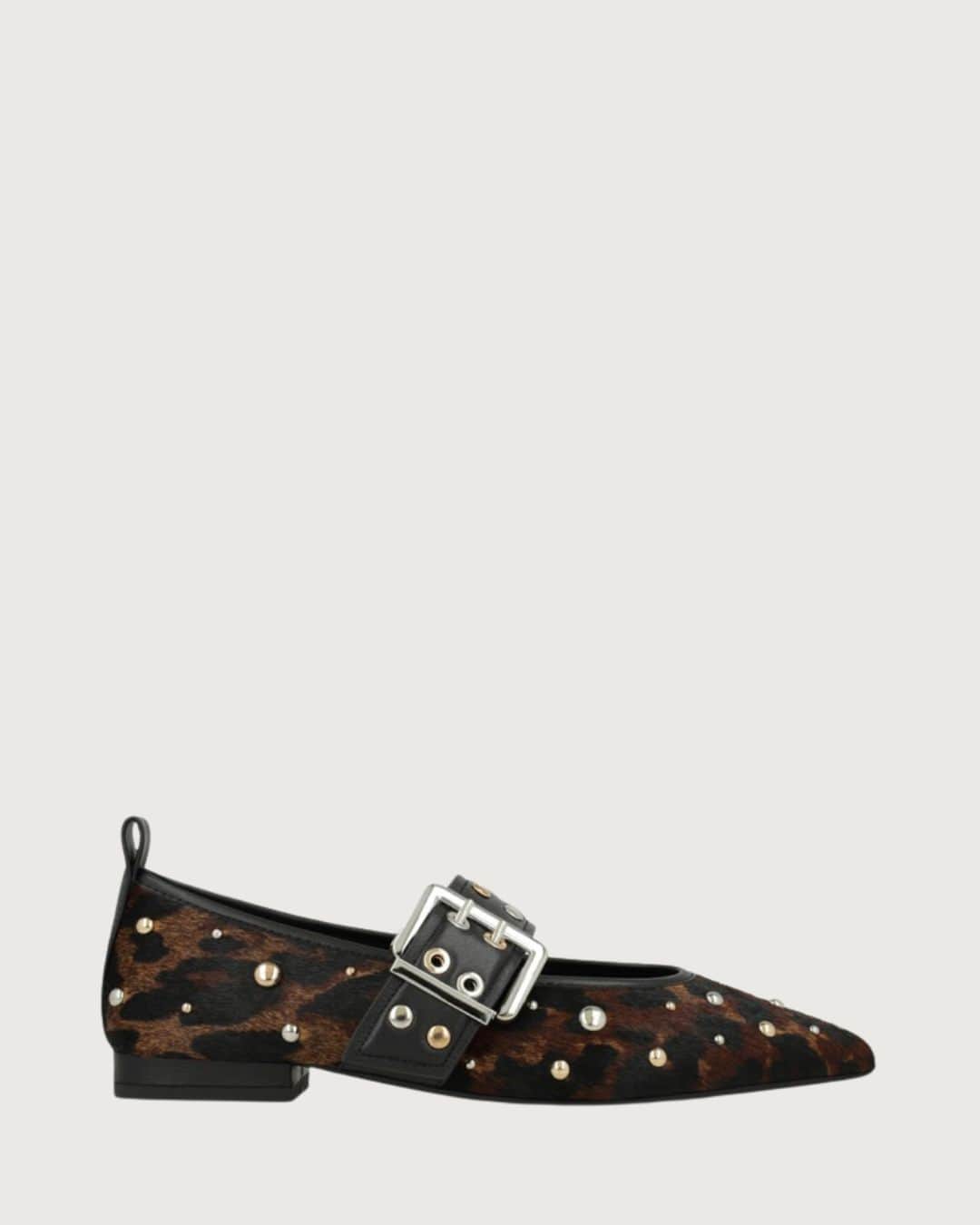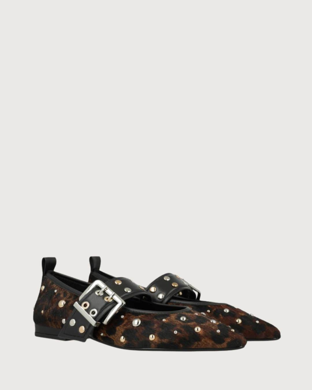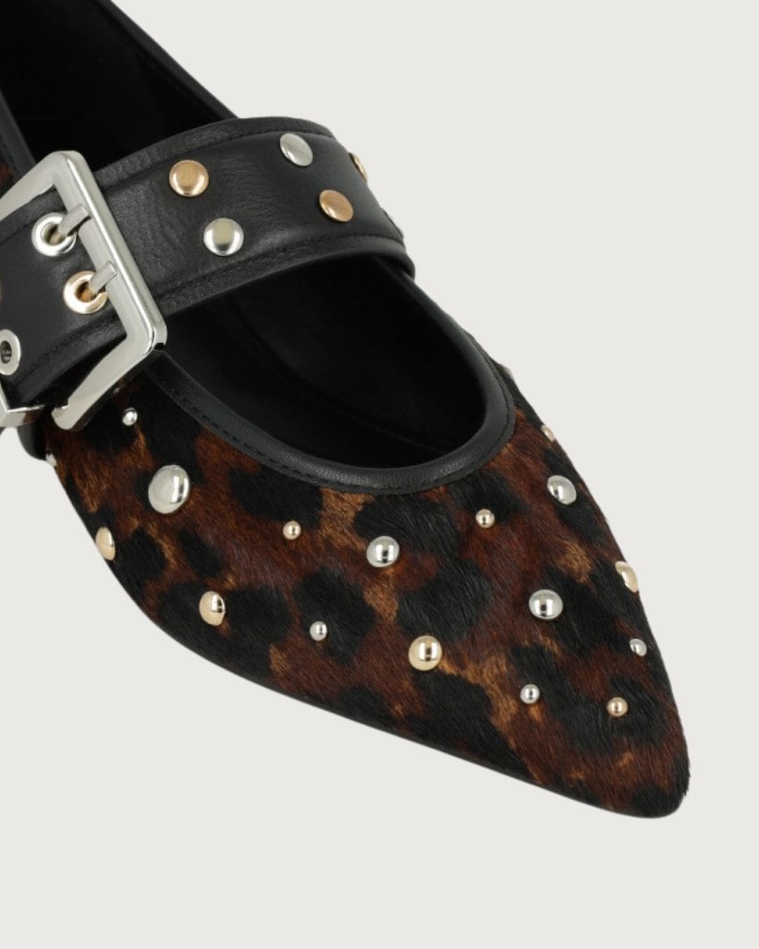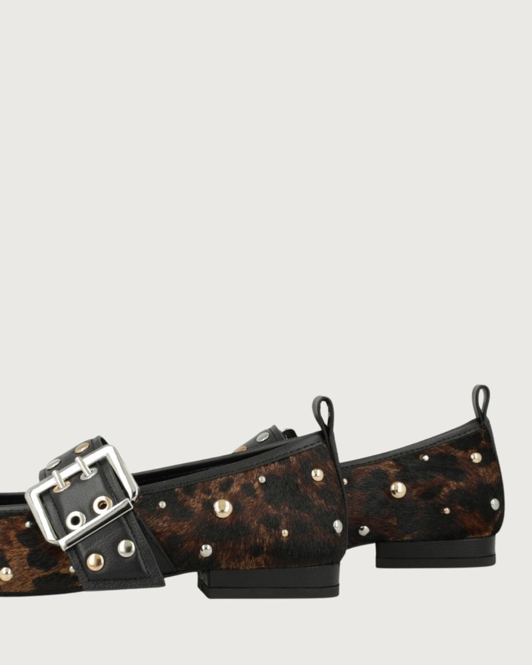 Bailarinas fabricadas en piel con acabado efecto pelo y diseñadas con tachas metálicas y tira en empeine con hebilla aportando personalidad sin renunciar a la comodidad. Incluye planta new gel para mayor comodidad en todas tus pisadas.
