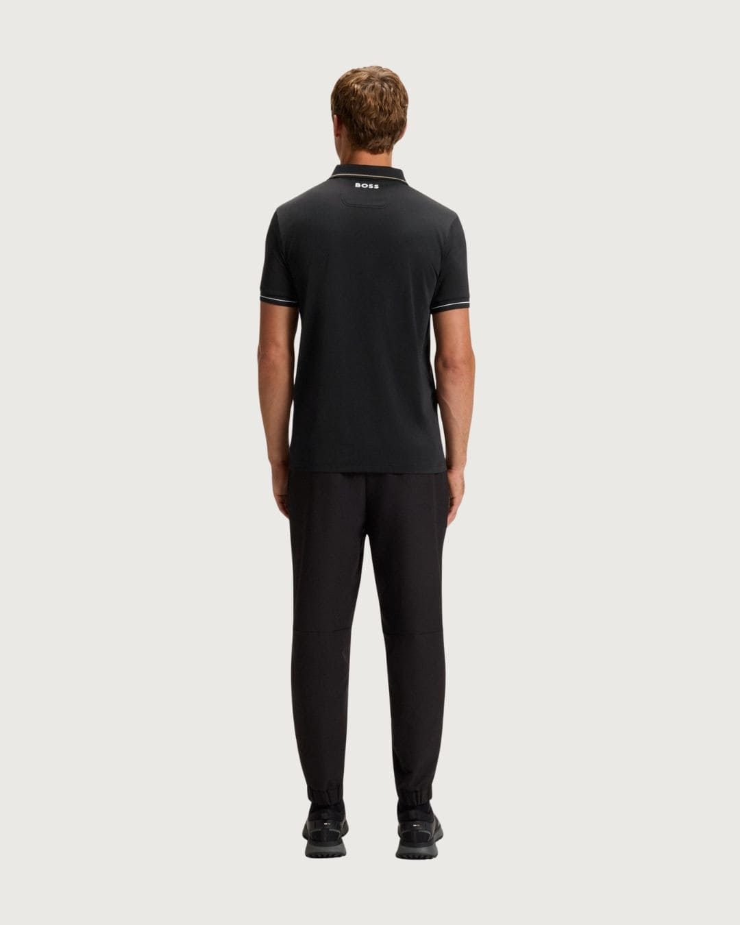 Un inconfundible polo BOSS Hombre slim fit elaborado en material elástico con control de la humedad, ribetes y logos en contraste.