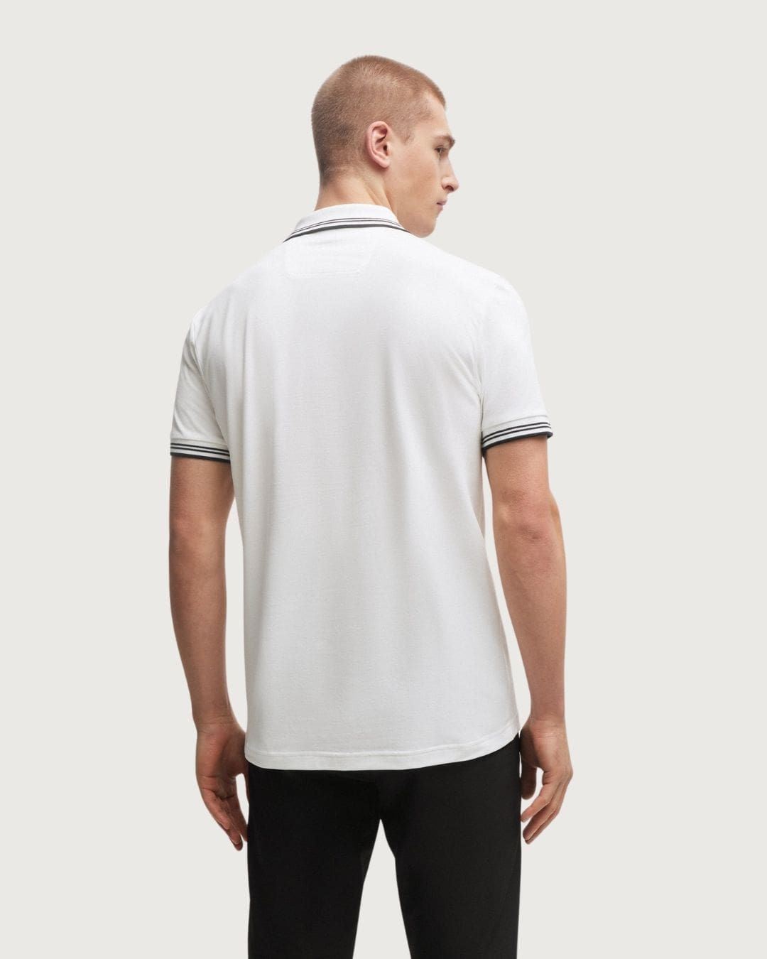 Un polo BOSS Hombre moderno elaborado con un corte definido en algodón elástico con rayas en contraste y detalles de la marca.