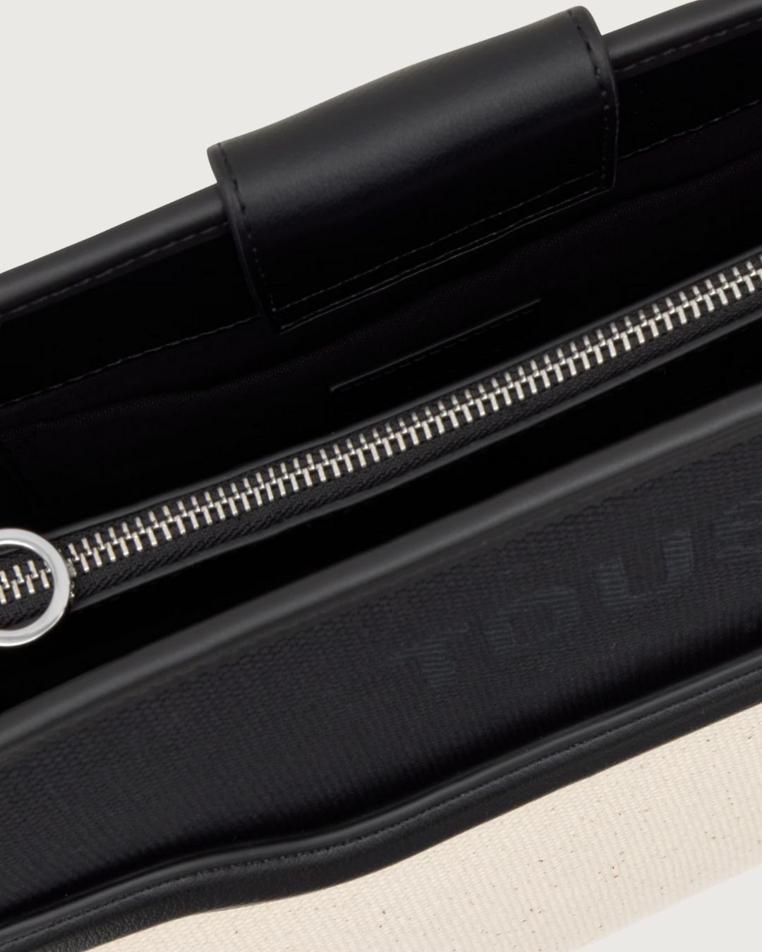 Bolso shopper Audree Canvas de algodón con detalles de poliuretano y piel vacuna con certificación LWG en color negro. Cierre magnético. Dos compartimentos separados por uno con cremallera. Bolsillo interior y bolsillo exterior abiertos. Asa de hombro extraíble. Medidas: 26 x 33,5 x 13,5 cm.