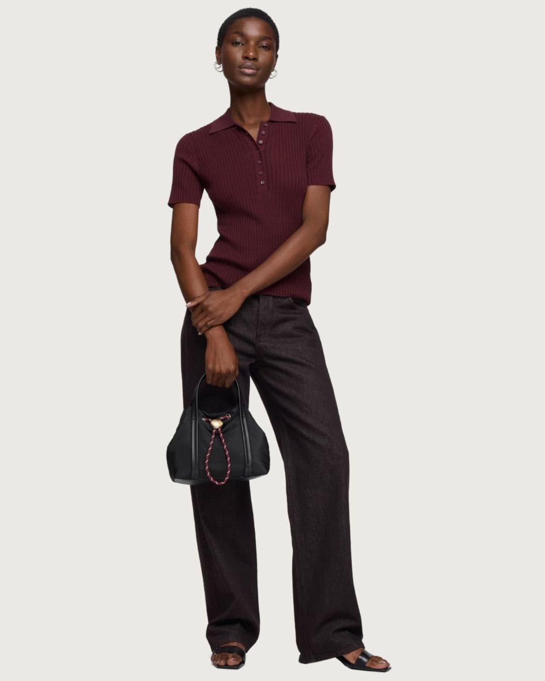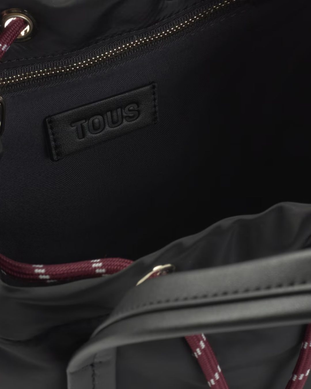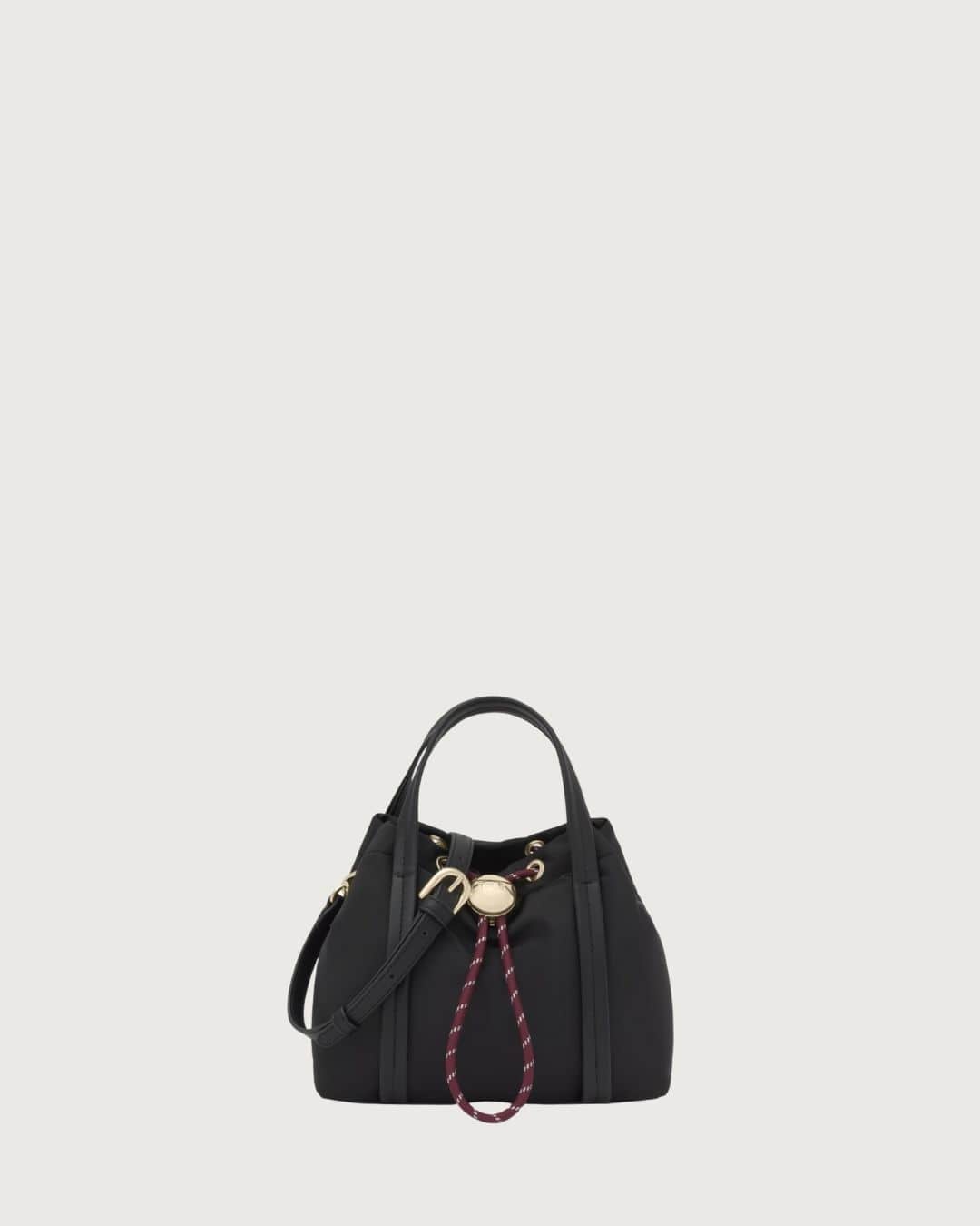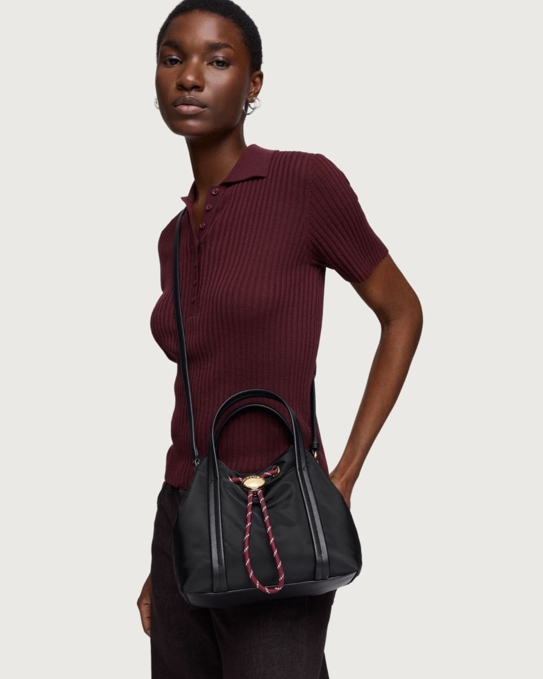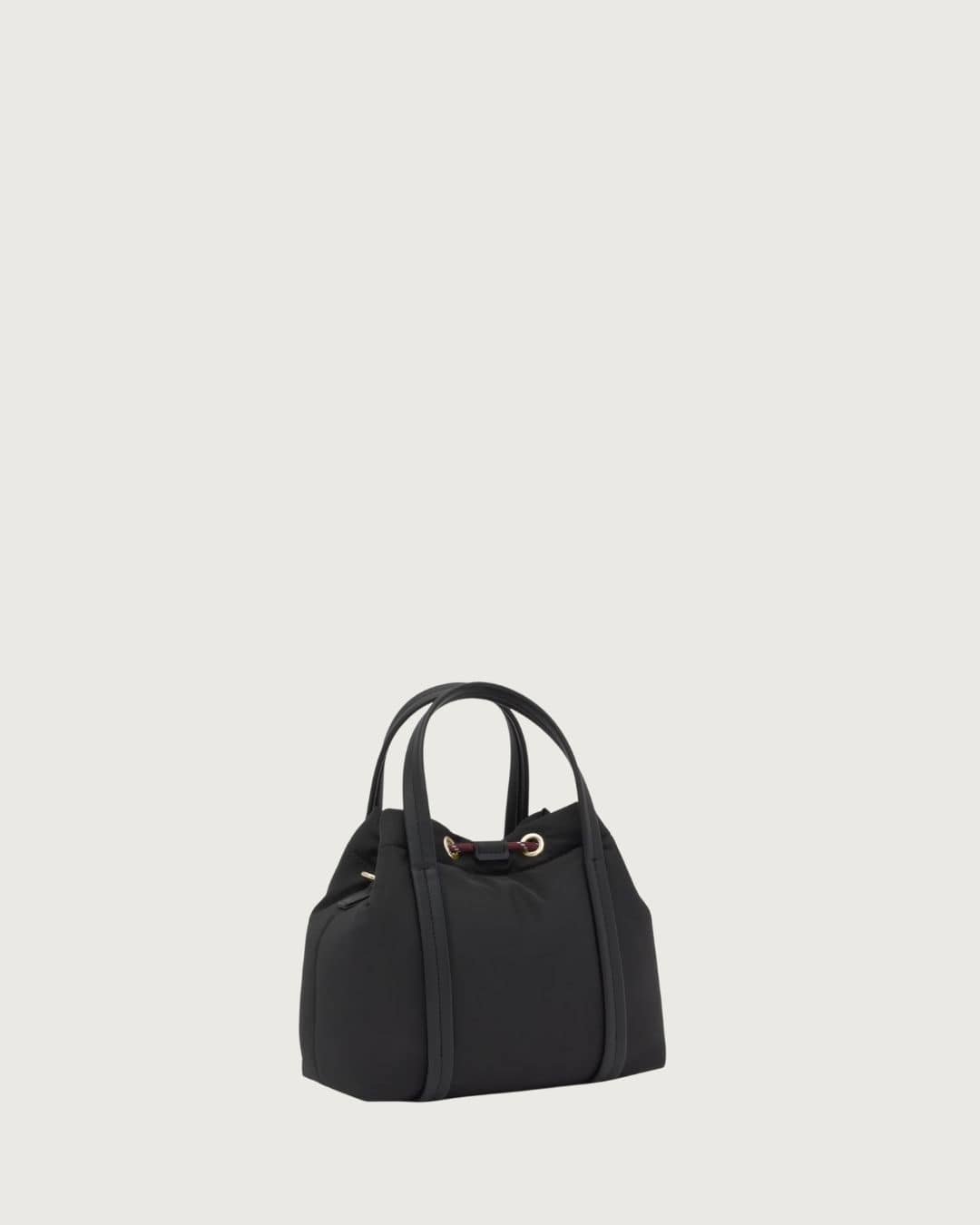 Bolso bombonera Empire Soft de poliéster reciclado con detalles de poliuretano en color negro. Cierre con cordón ajustable. En el interior incluye un bolsillo. Asas fijas de mano y asa bandolera ajustable y desmontable. Medidas: 21 x 24 x 10 cm.