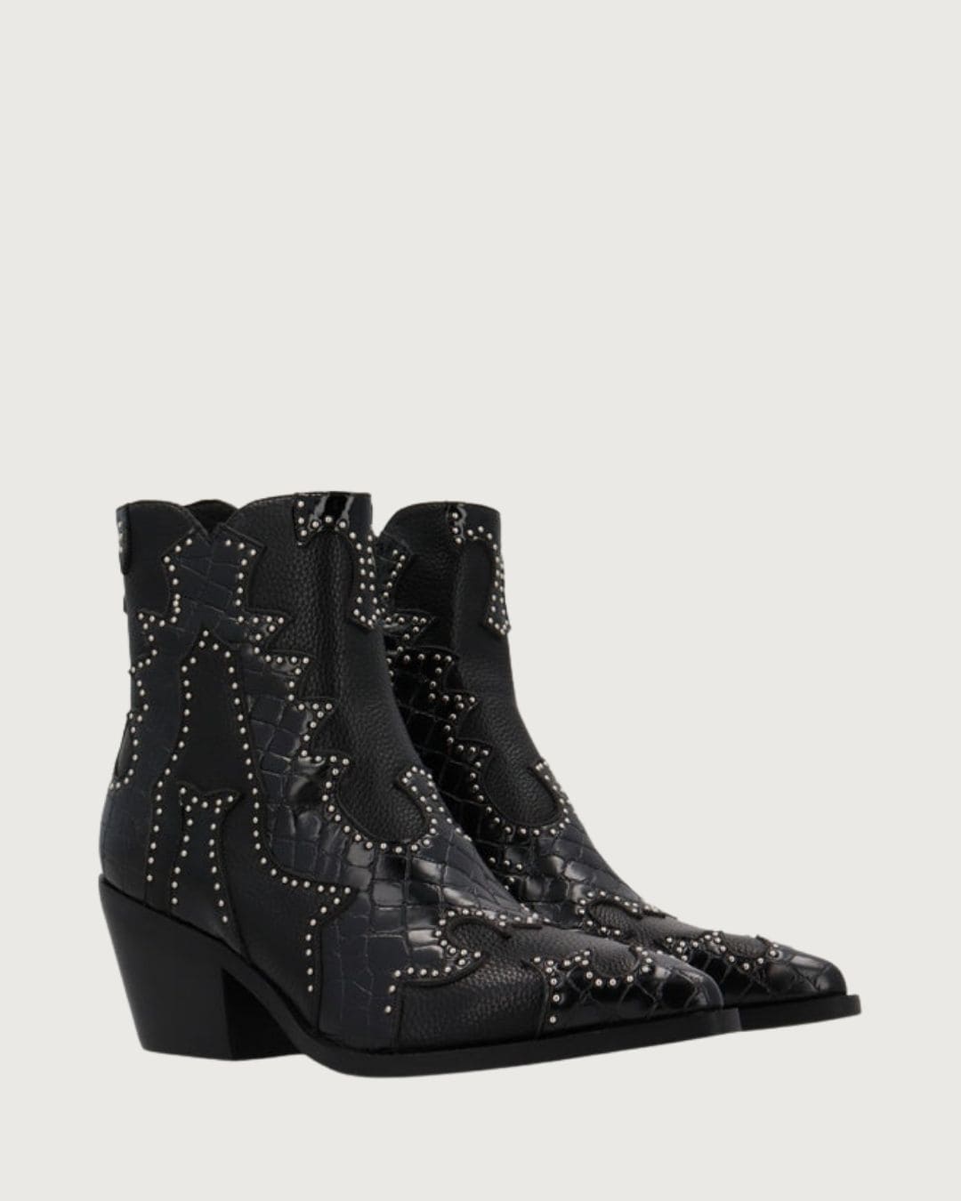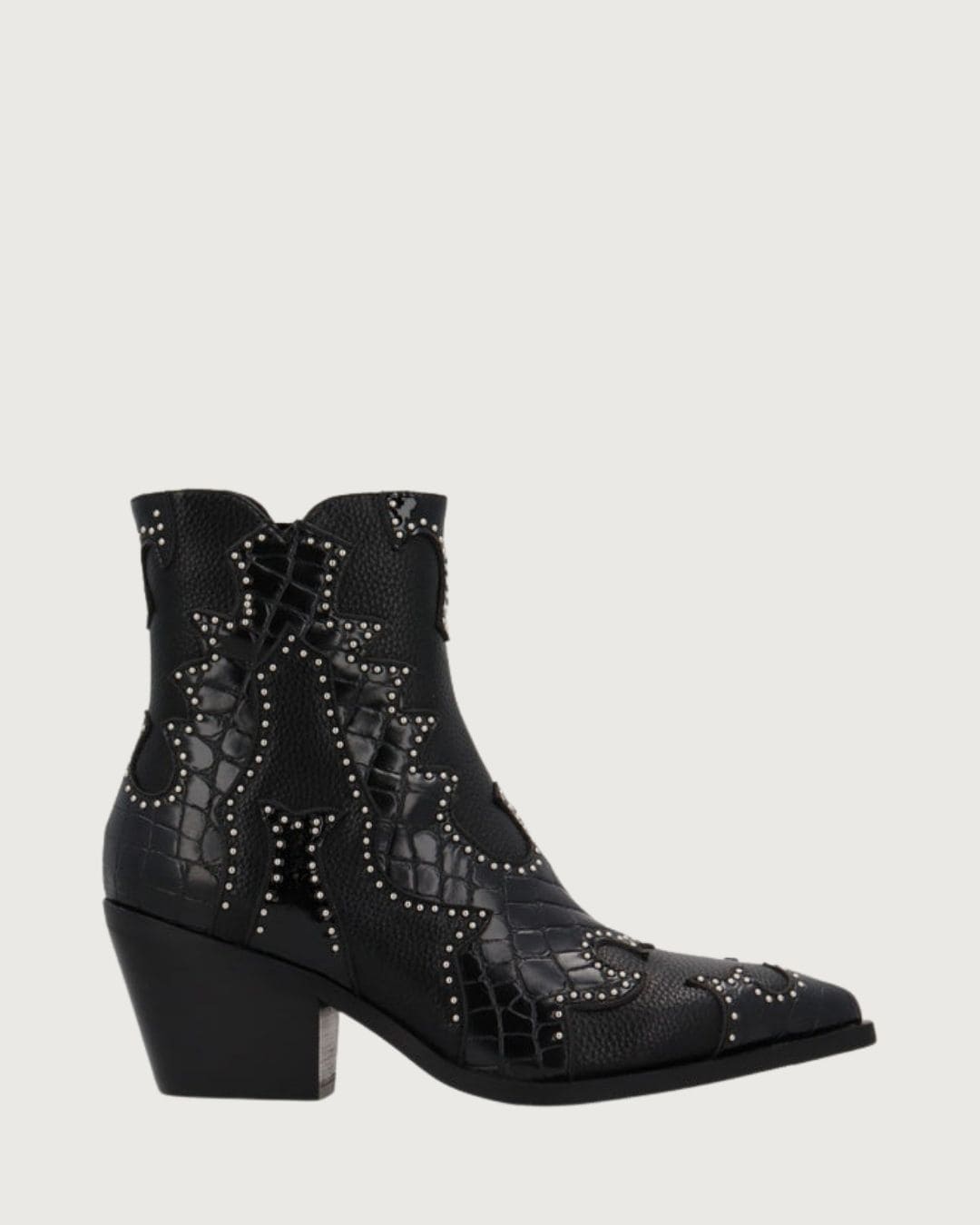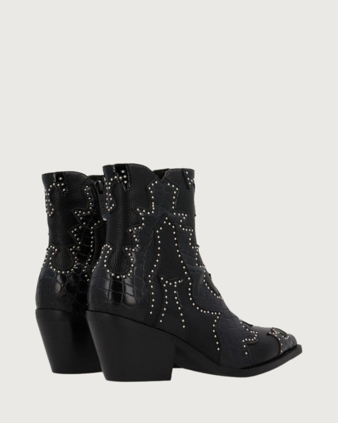 Botín fabricado con materiales sintéticos con microremaches que aportan carácter y sofisticación. Altura tacón: 6,5 cm