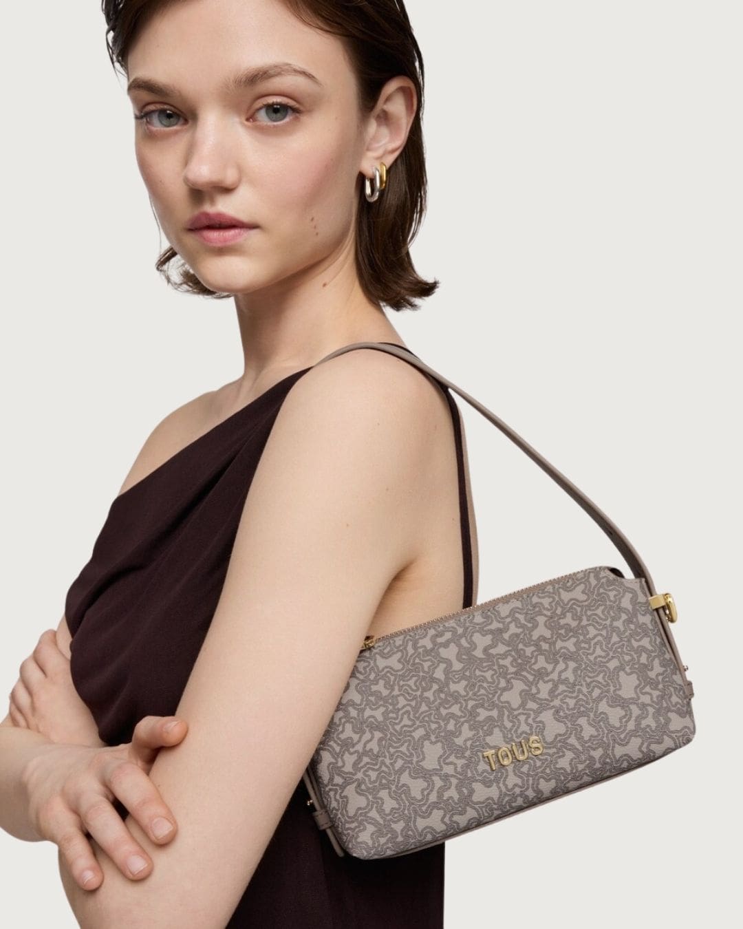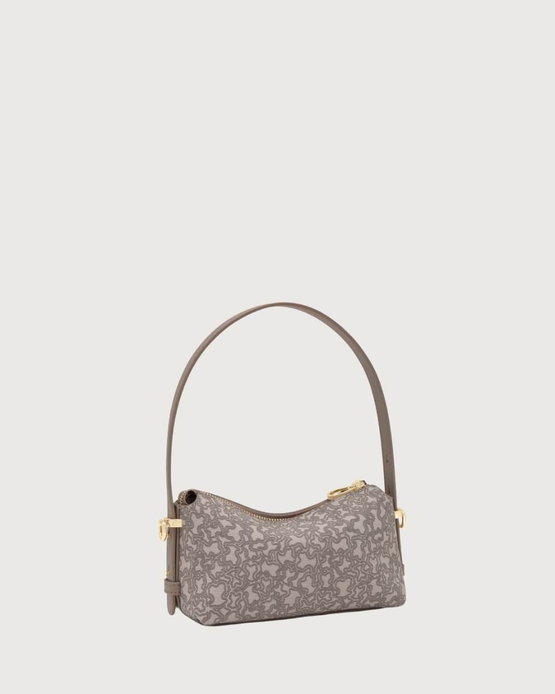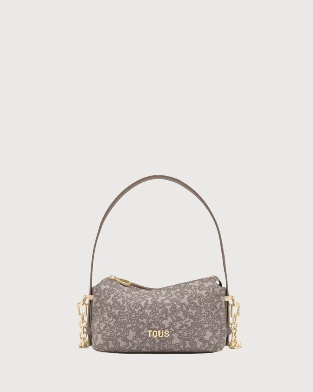 Minibolso Kaos Mini Lines de lona con detalles de poliuretano en color topo. Cierre de cremallera. Asa de hombro ajustable y asa bandolera desmontable. Medidas: 11,5 x 21 x 9 cm.